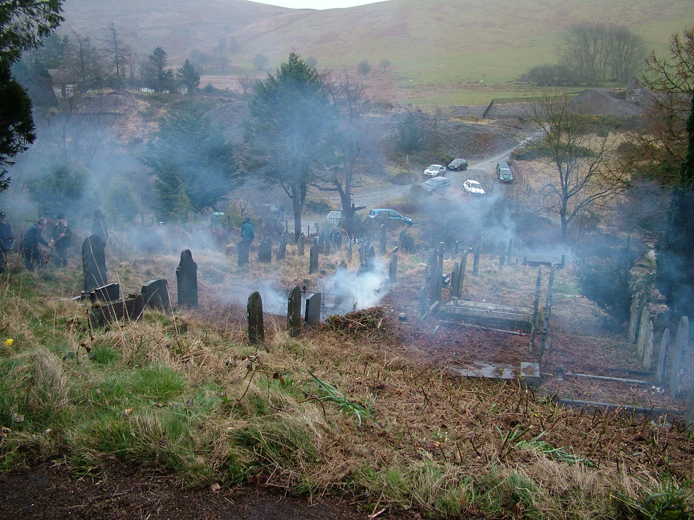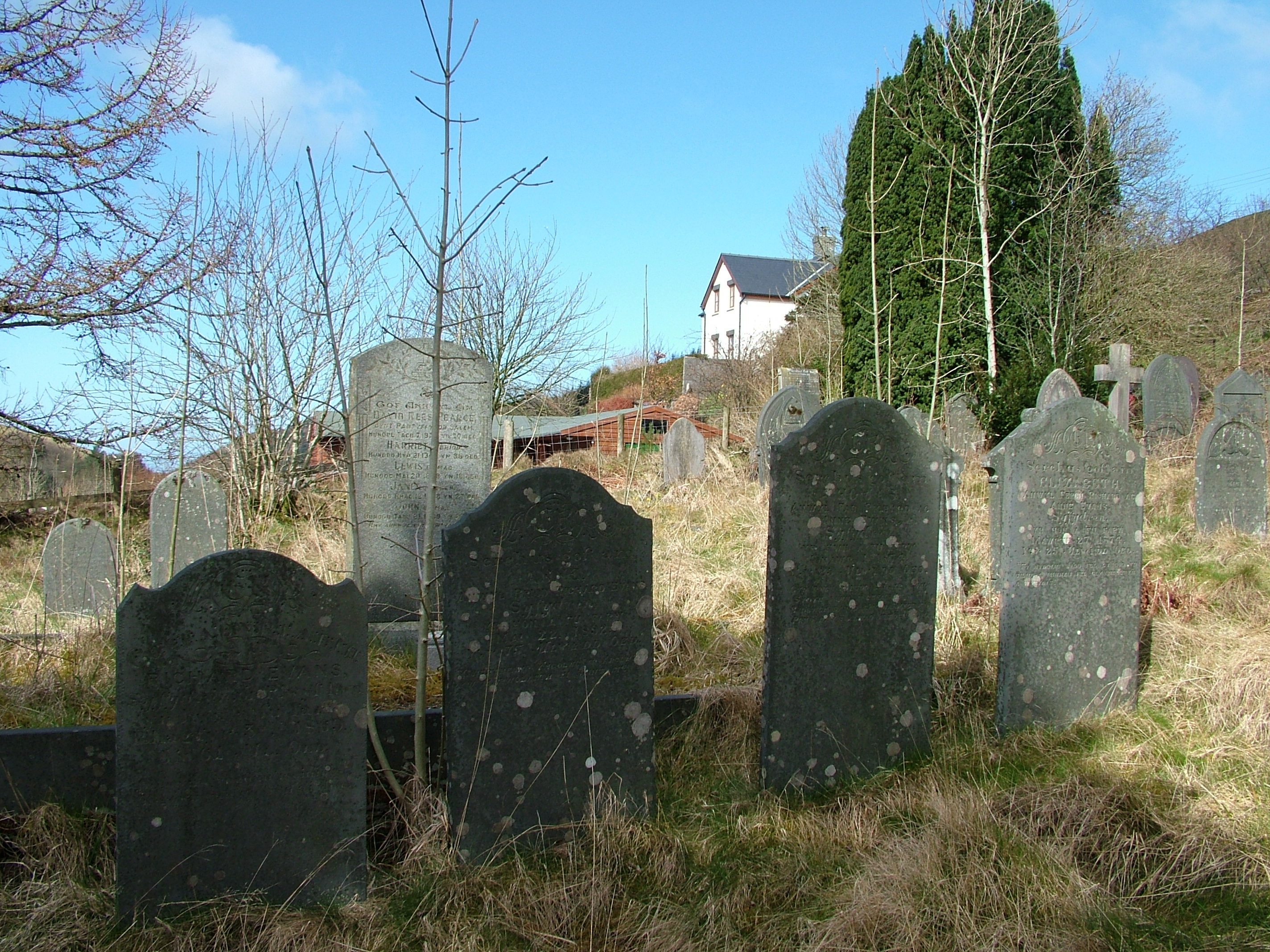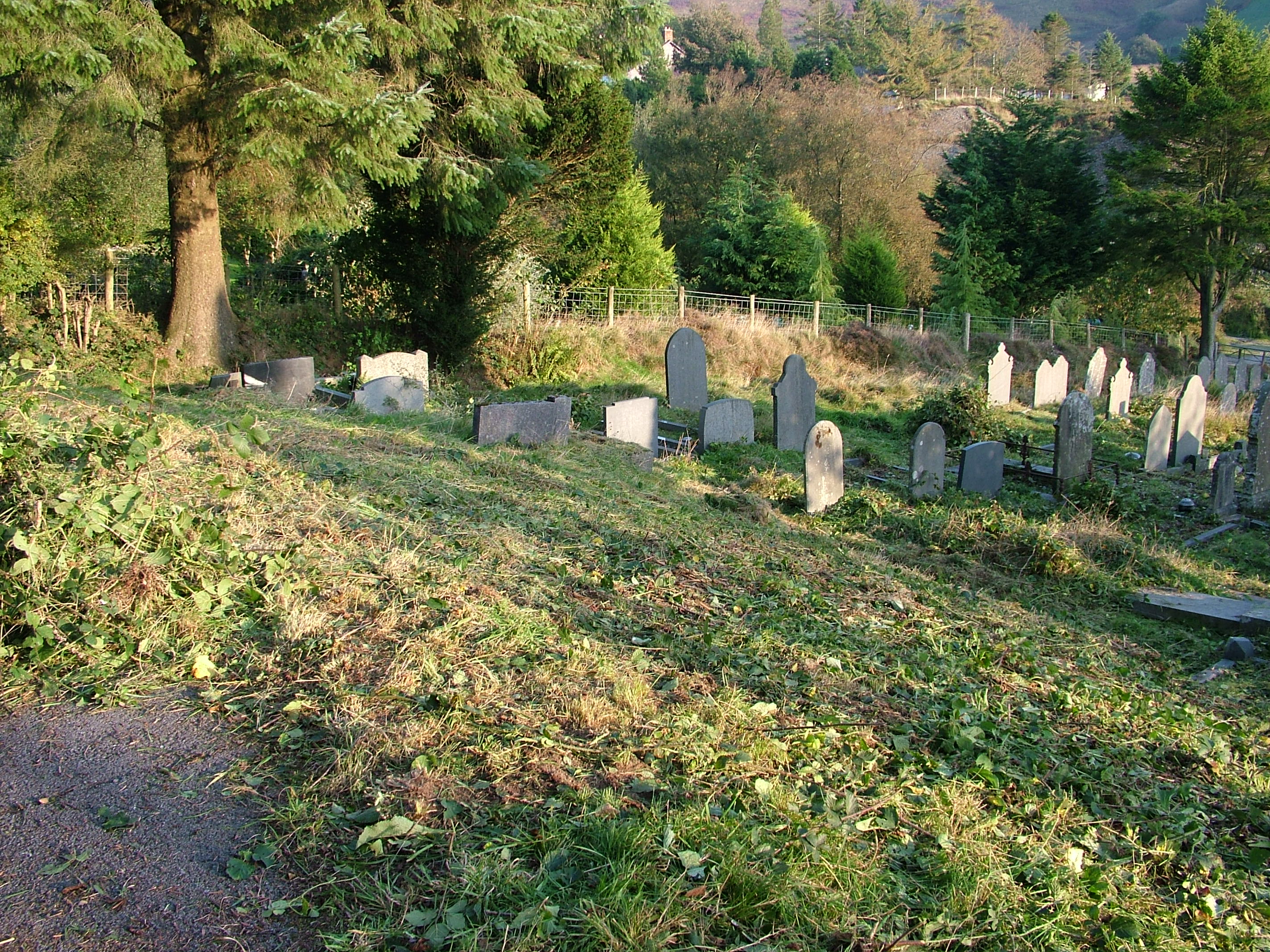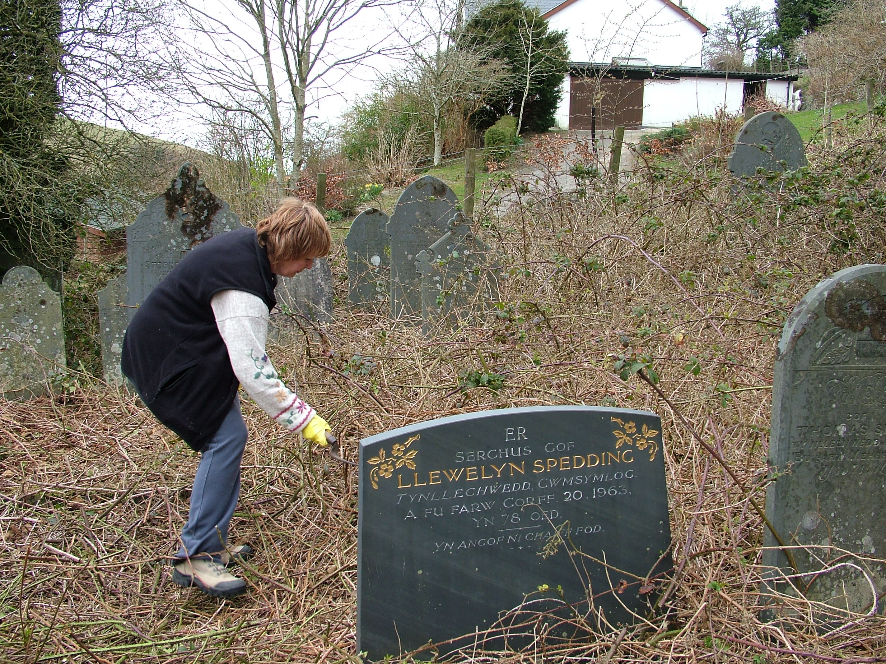 “Thank you so very much for your letter and photographs of Cwmsymlog. My mother, husband David and I visited the graveyard on Bank Holiday Monday to place flowers on family graves ‑ and we couldn’t believe our eyes how the place had changed! We could actually see the path and walk amongst the graves.–We hadn’t realised that you had been there the first weekend in April ‑ I’m so sorry to have missed you all, and the opportunity to thank your team for such a fantastic job. You have all worked extremely hard and we (the Chapel Committee) and myself personally can’t thank you enough for what you have done. It’s so heart warming to know that people like you exist and that you are so ready to help in projects such as these. My mother shed a tear or two when she saw how wonderful the cemetery looked and wants to convey her sincerest thanks to you all.–Once again Mr. Levins, thank you for keeping the Spirit of the Miners alive.–Thank you from the bottom of our hearts for your concern and your hard work. Diolch yn fawr and God Bless you all.”